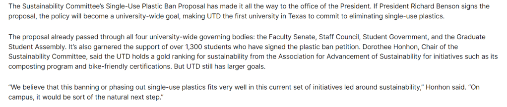 Here’s an article about the initiative to ban single-use plastics on UTD campus which was published in December 2022 in the student-led newspaper The Mercury.